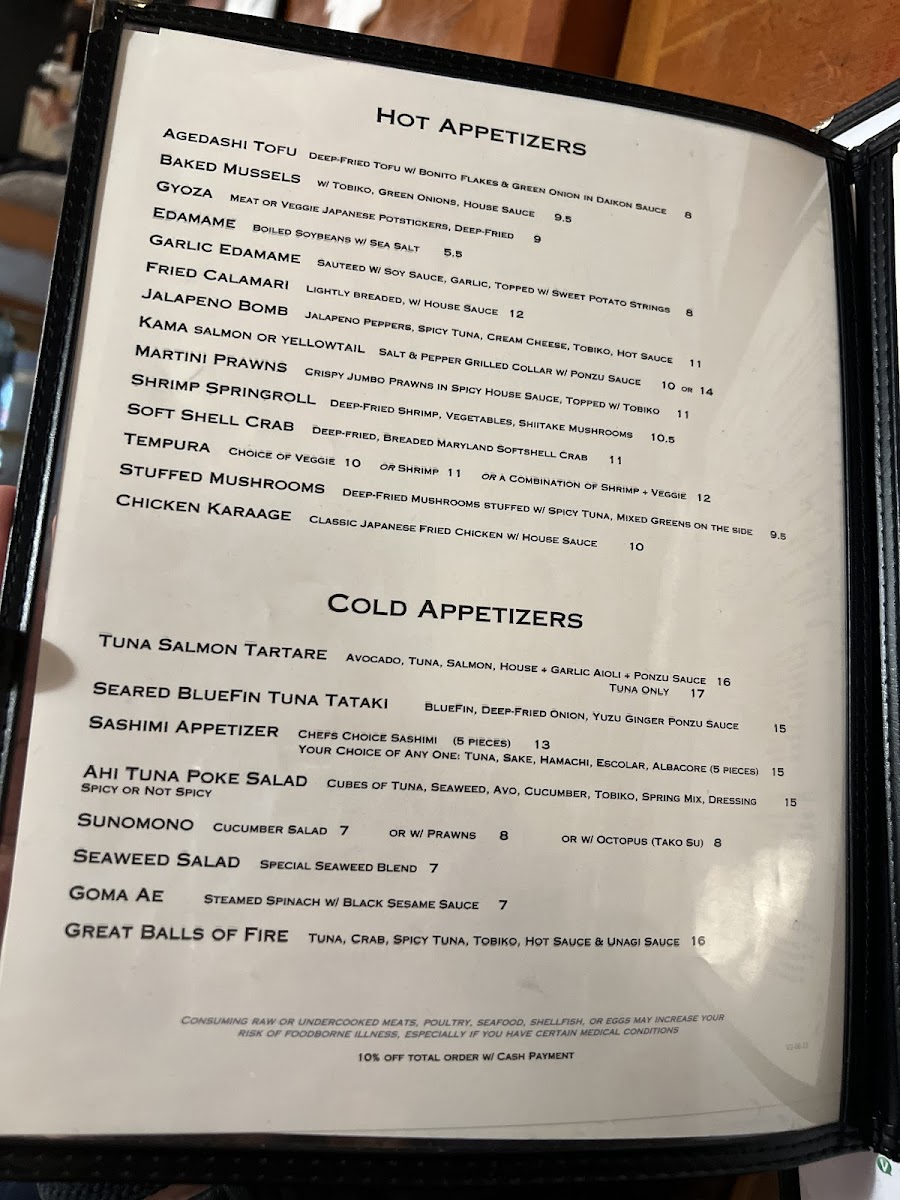 Hot. Most popular. In: shrimp tempura, avocado, crab.Out: spicy tuna, salmon, super white tuna, soy paper. On top: spicy/wasabi mayo, unagi sauce, green onion, tobiko.